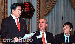 中國人壽董事長王憲章(左)向紐約證交所董事會臨時主席兼首席執(zhí)行官約翰·里德(中)、國壽上市案的全球聯(lián)席協(xié)調人——中國國際金融有限公司代表朱云來(右)等致辭。