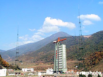 中國(guó)“雙星計(jì)劃”首發(fā)星箭組合體——“探測(cè)一號(hào)”衛(wèi)星和“長(zhǎng)征二號(hào)丙”改進(jìn)型運(yùn)載火箭在西昌衛(wèi)星發(fā)射中心整裝待發(fā)。 中新社記者 孫自法 攝