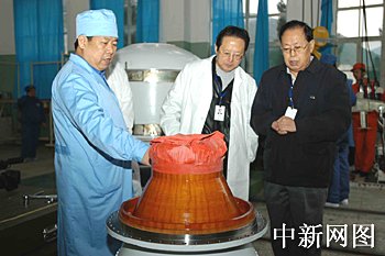 “長征二號丙”改進(jìn)型運(yùn)載火箭總指揮鄭全寶(中)、總設(shè)計(jì)師李占奎(右)查看火箭上面級發(fā)動機(jī)。荊鷹 攝