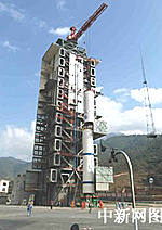 圖:"長征二號丙"改進(jìn)型運(yùn)載火箭一、二級吊裝上發(fā)射塔架(12月30日 03:47)