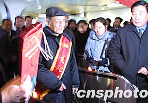 北京地鐵13號線自動收費(fèi)系統(tǒng)(簡稱AFC系統(tǒng))三十一日早晨五點(diǎn)半正式開通,作為新系統(tǒng)的第一位乘客七十歲的老人洪先生身披紅色綬帶通過了地鐵自動檢票閘機(jī)口。中新社記者:廖文靜