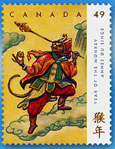 發(fā)行的2款猴年郵票取材于中國古典名著“西游記”故事中的美猴王孫悟空。面值49加分國內(nèi)郵資郵票發(fā)行量800萬張,面值1.4加元國際郵資郵票發(fā)行量170萬張。畫面分別是陪同唐僧去“西天”取經(jīng)途中手執(zhí)金箍棒騰云駕霧的孫悟空和與玉皇大帝智斗鬧天空的孫悟空。該組郵票設(shè)計者為安大略藝術(shù)學(xué)院畢業(yè)的路易斯費肖夫,他曾設(shè)計許多加拿大郵票圖案。