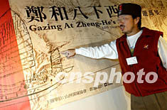 “臺灣山河探險協(xié)會”理事長徐海鵬一月八日在北京舉行的新聞發(fā)布會上介紹鄭和下西洋航海路線圖,并號召海峽兩岸共同參與“鄭和八下西洋”探險活動,以紀念明朝偉大航海家鄭和六百年前下西洋的壯舉。探險隊在精心挑選隊員后,將于2005年啟航,歷時三年走訪二十余個國家、數(shù)十個港口,2008年返航。中新社記者:毛建軍