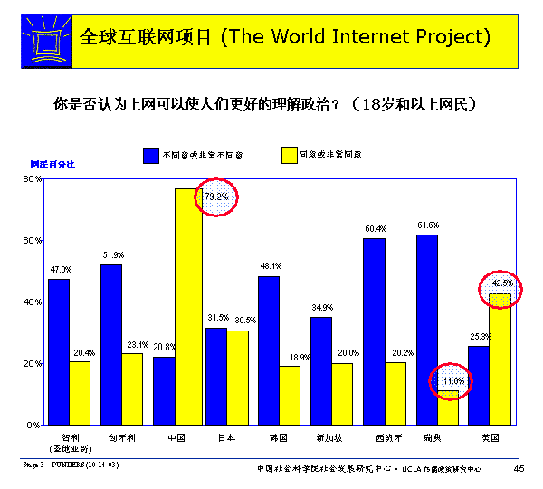 只有美國和中國的網(wǎng)民例外,中國的被訪網(wǎng)民中認為網(wǎng)絡可以幫助人們更好地理解政治的人超過了三分之二。和前面的問題一樣,這一結論與兩年前的調查結果完全符合。