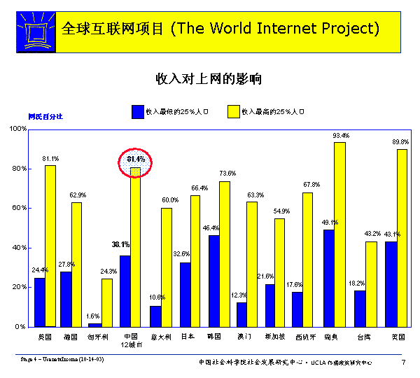 在所有WIP國(guó)家里,最富的四分之一人口比最窮的四分之一人口更傾向于上網(wǎng)(這里,中國(guó)數(shù)據(jù)中最富的四分之一網(wǎng)民指(家庭年收入超過(guò)5000元者),而最窮的四分之一網(wǎng)民指家庭年收入低于1600元者)。由此可見(jiàn),經(jīng)濟(jì)收入是影響人們上網(wǎng)的重要因素。