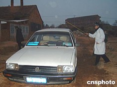 疫區(qū)工作人員對出入車輛進(jìn)行嚴(yán)格消毒。作者:艾啟平 徐晶波