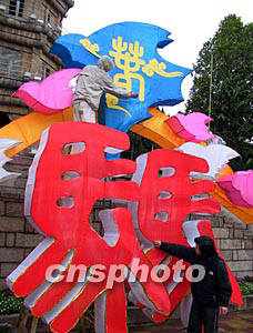 二名馬祖制燈藝人四日冒春雨在馬尾元宵節(jié)燈會(huì)會(huì)場(chǎng)的馬祖展區(qū)內(nèi),為一盞“兩馬烘春”大型主題花燈裝點(diǎn)。作者:劉可耕