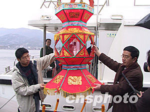 二月四日,馬尾民間節(jié)人制作的七盞大花燈在馬尾港由有關(guān)人員搬上馬祖“閩珠二號(hào)”,準(zhǔn)備參加馬祖元宵燈會(huì)。今年元宵佳節(jié),馬祖、馬尾將第二次共同舉行“兩馬”鬧元宵燈會(huì)活動(dòng)。作者:劉可耕