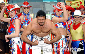 俄羅斯莫斯科馬戲團2月5日移師觀塘,全新節(jié)目首次在香港曝光,包括珍貴的白老虎、雜耍藝術、狗仔足球隊、艷麗四射的舞蹈等節(jié)目,給觀眾帶來刺激和歡樂。圖為馬戲團大力士弗克烈甸與艷麗四射的舞蹈女郎。作者:洪少葵