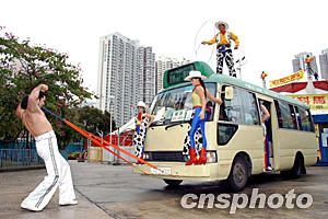 正在香港巡回演出的俄羅斯馬戲團2月5日移師觀塘,馬戲團大力士弗克烈甸施展神乎奇技的力量,將滿載演員的公共小巴拉入星輝帳篷。作者:洪少葵