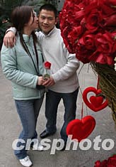 情人節(jié)之日,一位北京男士在紅玫瑰花和同心結(jié)前喜得女友浪漫的一吻。中新社記者:史利