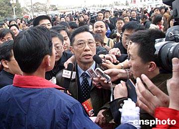 下午二點(diǎn)多,距全國(guó)政協(xié)十屆二次會(huì)議開幕尚有半個(gè)小時(shí),但人民大會(huì)堂前已聚滿海內(nèi)外記者,各路英雄架起長(zhǎng)槍短炮,敬候“獵物”。