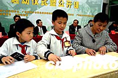 “希望工程——金龍魚農(nóng)民工子女助學基金”儀式課三月十六日在廣州新蕾五星學校舉行。首批2000名農(nóng)民工子女得到資助。這些孩子將從2004年起得到每學年六百至九百元人民幣的助學金,以幫助其完成小學學業(yè)。作者:劉衛(wèi)勇