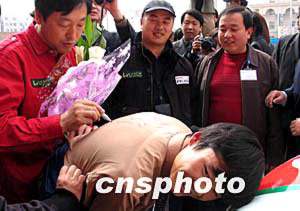三月十八日,中國車王盧寧軍和他的“座騎”中國出產(chǎn)的帕拉丁汽車亮相蘭州,熱情的車迷請盧寧軍為在衣服上簽名。作者:劉呈軍