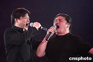 “歡歌2004演唱會(huì)”在座無虛席的首都體育館隆重上演,中國內(nèi)地歌手劉歡(右)與特邀嘉賓香港歌手莫華倫一起為到場歌迷獻(xiàn)上了眾多耳熟能詳?shù)母枨。作?高遠(yuǎn)