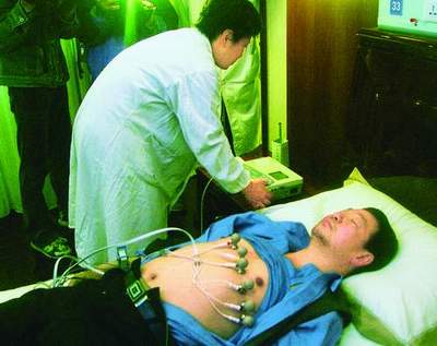 昨日,是“東方超人”陳建民正式挑戰(zhàn)饑餓極限49天的日子。記者(注:成都日?qǐng)?bào)記者)早早來(lái)到陳建民挑戰(zhàn)地點(diǎn)碧峰峽景區(qū),而英國(guó)天空電視臺(tái)、中央電視臺(tái)、新華社等國(guó)內(nèi)外媒體也早已全副武裝。剛進(jìn)碧峰峽,只見(jiàn)專程為陳建民表演而量身定做的16平方米的八角玻璃房已架在四根14米高柱子上,整個(gè)玻璃房懸在半空,以便所有人都能仔細(xì)看到他在房里的一舉一動(dòng)。