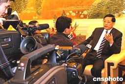 沈陽市長陳政高在北京人民大會堂接受記者采訪,介紹東北老工業(yè)基地經(jīng)濟(jì)振興問題。中新社記者:王麗南