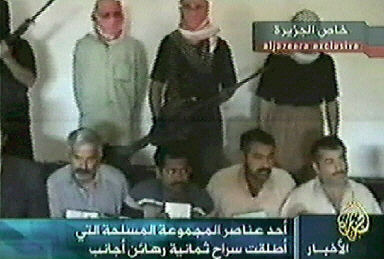 半島電視臺(tái)11日播放的一盤錄像帶顯示,,伊拉克反美武裝分子即將釋放8名外國(guó)人質(zhì),包括2名土耳其人、3名巴基斯坦人、1名尼泊爾人、1名菲律賓人和1名印度人。