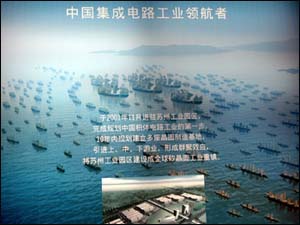 宋濤在鄭和艦隊(duì)帷幕前向記者介紹說,和艦科技是一家外資獨(dú)資企業(yè),注冊資本三點(diǎn)五億美金,二○○一年十一月進(jìn)駐蘇州工業(yè)園區(qū),第一座晶圓制造廠占地一點(diǎn)三平方公里,而蘇州給和艦科技留下了一百十公頃土地。