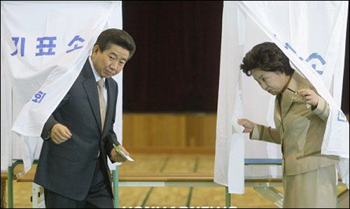 在韓國歷史上、第一個(gè)遭國會(huì)反對黨彈劾的總統(tǒng)盧武鉉,也在妻子的陪同下前往投票。盧武鉉也呼吁國民積極地參與投票。