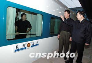 四月十七日晚,鐵道部副部長孫永福(右)和北京鐵路局負(fù)責(zé)人在北京火車站為中國鐵路第五次提速的首列提速車送行。中國鐵路第五次提速十七日晚開始,新開行的十九對直達(dá)特快列車中,北京開往杭州的Z9次,于十八點(diǎn)五十三分首發(fā)開始運(yùn)行。中新社記者:王麗南