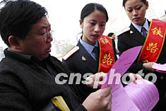 四月十八日,山西省太原火車站的工作人員向過往旅客發(fā)放新列車時(shí)刻表。當(dāng)日是全國鐵路提速第一天,太原火車站設(shè)立咨詢臺(tái),為旅客提供鐵路提速等各方面的信息。作者:陳帆