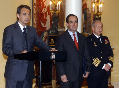 4月18日,西班牙新任首相薩帕特羅(左一)在馬德里宣布,他已下令駐伊拉克的1300名西班牙軍人盡早撤離回國(guó)。