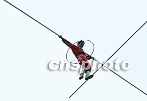 “高空王子”阿迪力唯一傳人沙特爾五月一日起在廣州香江野生動物世界挑戰(zhàn)吉尼斯世界紀(jì)錄。這位十五歲的維吾爾族少年將在虎山上空度過二百小時,挑戰(zhàn)生存極限。圖為小伙子在鋼絲上表演呼啦圈。作者:梁永強(qiáng)