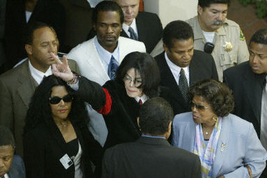 面對(duì)大批前來聲援與支持的歌迷,杰克遜僅向群眾揮揮手便快步進(jìn)入法院。與上次出庭不同的是,杰克遜今天神輕相當(dāng)輕松自在,不時(shí)露出微笑。雖然仍然有助理在旁亦步亦趨為他撐著黑傘,但杰克遜當(dāng)天并沒戴著“招牌形象”的墨鏡,而是一般眼鏡。