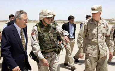 中新網(wǎng)5月13日電 美國(guó)國(guó)防部長(zhǎng)拉姆斯菲爾德和美國(guó)參聯(lián)會(huì)主席邁爾斯13日抵達(dá)巴格達(dá),對(duì)伊拉克展開(kāi)“閃電式”訪(fǎng)問(wèn)。