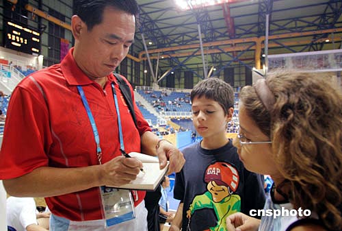 雅典奧運會乒乓球比賽期間,坐在觀眾席上觀戰(zhàn)的中國乒乓球總教練蔡振華成了外國小球迷追逐的明星。中新社記者:張煒
