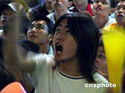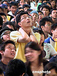 中國臺北隊(duì)在雅典奧運(yùn)會棒球賽中3:4惜敗日本隊(duì),臺北球迷為之惋惜。中新社記者:曾嘉