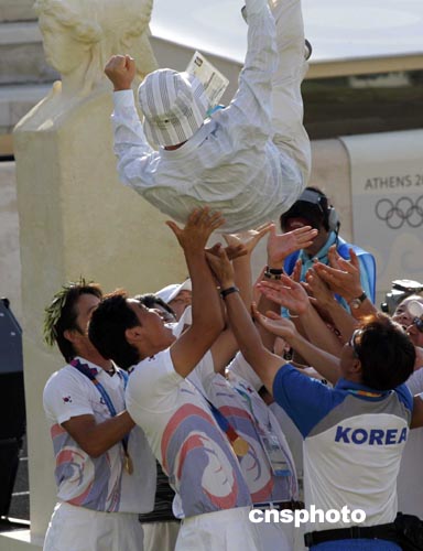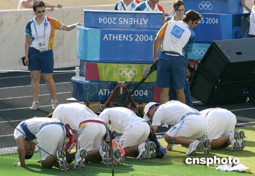 當(dāng)?shù)貢r間8月21日下午,在雅典奧運(yùn)會男子射箭團(tuán)體決賽中,韓國男子射箭隊?wèi){借強(qiáng)勁實(shí)力奪得金牌。中新社記者:張煒