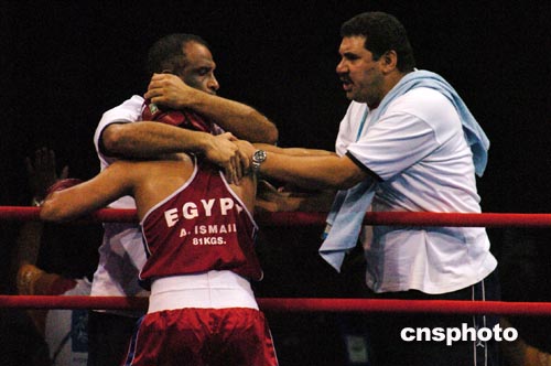 雅典時間八月二十四日,在奧運拳擊四分之一決賽中,埃及選手艾哈邁德?lián)魝ED選手后,因醫(yī)生決定中止比賽而宣告獲勝,艾哈邁德跪地向在場觀眾道歉。作者:陳佳