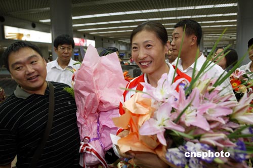 圖為奧運(yùn)會(huì)羽毛球女單冠軍張寧手持鮮花走出機(jī)場(chǎng)。