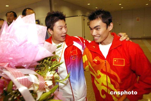 8月26日,北京首都國(guó)際機(jī)場(chǎng)又迎來一批載譽(yù)歸來的奧運(yùn)健兒,包括羽毛球、乒乓球、游泳、體操、舉重等200多名選手,他們?cè)跈C(jī)場(chǎng)受到英雄般的歡迎,幾乎每個(gè)人都被鮮花包圍。圖為中國(guó)體操名將李小鵬(左)在鮮花的簇?fù)硐屡c前來迎接的隊(duì)友梁富亮相談甚歡。中新社記者:盛佳鵬