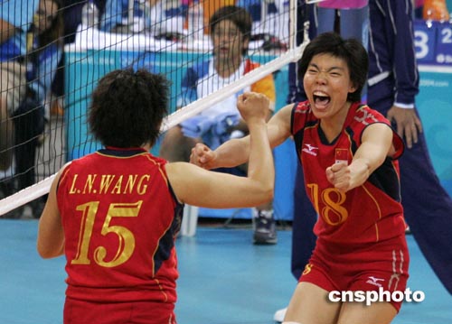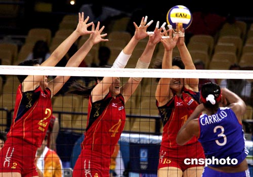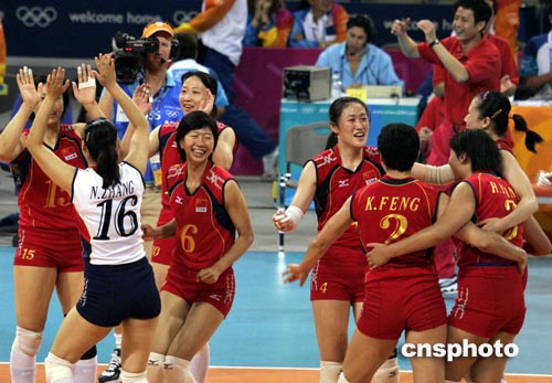 北京時(shí)間8月27日凌晨,在雅典奧運(yùn)會(huì)女子排球第二場(chǎng)半決賽中,中國(guó)女排以3比2險(xiǎn)勝古巴,晉級(jí)決賽。中新社記者:張煒
