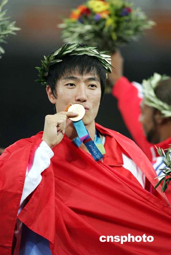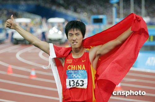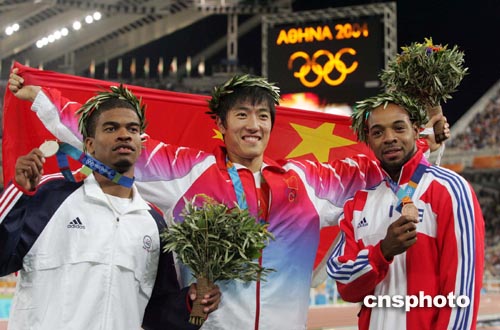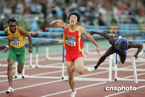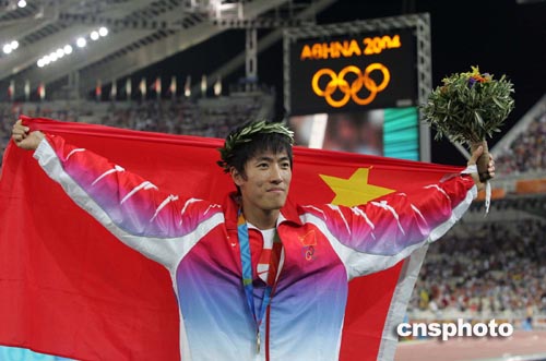 當?shù)貢r間八月二十七日晚,在雅典奧運會男子一百一十米欄比賽中,中國選手劉翔以十二秒九一的成績獲得冠軍并打破奧運會紀錄。中新社記者:毛建軍
