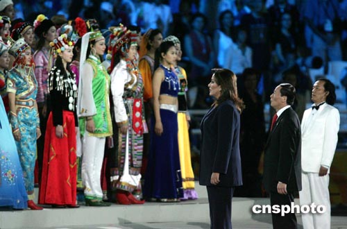 當?shù)貢r間八月二十九日,第二十八屆奧林匹克運動會在雅典圓滿結(jié)束。北京市長王歧山(前中)出席閉幕式。中新社記者:毛建軍