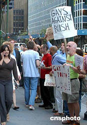 美東時(shí)間九月一日中午,紐約一百多名同性戀者聚集在共和黨代表準(zhǔn)備就餐的餐廳門口,打著“同性戀者反布什”的標(biāo)語牌,抗議布什競選連任總統(tǒng)。年初起,布什不斷主張禁止同性婚姻。作者:龔文謨