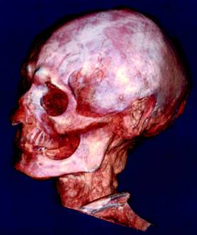 在實施木乃伊面容復原計劃時,由菲德瑞克博士領導的專家小組選中了一個3000歲的木乃伊。他生活在公元前945-前715年,生前是一個技術工人。該木乃伊于1900年在皇后谷地區(qū)被發(fā)掘出來,隨后又被送入埃及博物館。“手術”過程中,科學家們把木乃伊置于掃描儀上,以平均每27.4秒顯示335幀圖像的速度進行掃描。所有的圖像都被存入電腦的記憶系統(tǒng)中,最后使用特殊軟件在電腦中將裹尸布揭去。隨后,科學家們根據(jù)圖像數(shù)據(jù),運用整形技術將頭骨復原。最后,他們以暴露在木乃伊裹尸布之外的面部皮膚和肌肉作為參照依據(jù),用特殊材料制作成面部肌肉、耳朵、嘴巴等。