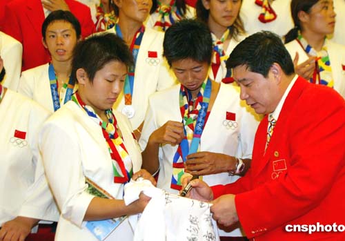 九月二日,第二十八屆奧運(yùn)會(huì)中國體育代表團(tuán)表彰大會(huì)在北京人民大會(huì)堂舉行,同為奧運(yùn)冠軍的小將王旭、李婷向前輩王義夫求取簽名。中新社記者:鄭萍萍