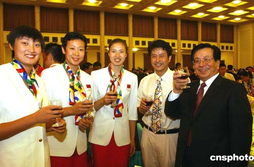九月二日晚,中共中央辦公廳、國務(wù)院辦公廳在北京人民大會(huì)堂宴會(huì)廳舉行招待會(huì),歡迎載譽(yù)歸來的第28屆奧運(yùn)會(huì)中國體育代表團(tuán)。中共中央政治局常委、國家副主席曾慶紅向獲得奧運(yùn)冠軍的中國女排祝酒。中新社記者:武仲林
