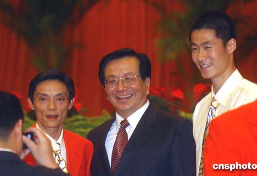 中共中央政治局常委、國家副主席曾慶紅與中國乒乓隊(duì)陸元盛、王勵(lì)勤合影留念。中新社記者:武仲林