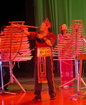 竹制樂(lè)器的演奏是越南藝術(shù)表演中獨(dú)具特色的,竹琴據(jù)介紹是仿鋼琴制成的,音色清脆,節(jié)奏明快,表演者的雙手在竹鍵上彈奏,速度快得讓觀(guān)眾眼花繚亂;德朗琴是用線(xiàn)將長(zhǎng)短不一的竹筒自上而下排掛在一個(gè)琴架上,敲擊琴筒的兩根細(xì)棒頂端各固定一個(gè)圓球,球上罩著一層布,敲擊竹筒時(shí)琴聲似幽谷回響;klong put琴由一排粗細(xì)有別的竹筒制成,演奏者根據(jù)每個(gè)竹筒的固定音調(diào),用手在筒端變換敲擊出舒緩綿長(zhǎng)的曲調(diào)來(lái);還有一個(gè)孔的簫,遠(yuǎn)遠(yuǎn)看去吹蕭人將蕭橫托在面前,用手在蕭的遠(yuǎn)端一開(kāi)一合地掌握音階,仿佛中國(guó)蕭從小孔開(kāi)合變換里發(fā)出的聲音,都從越南吹蕭人的手中魔幻般地變了出來(lái)。這些樂(lè)器既有獨(dú)奏,又有合奏,兼有表演的觀(guān)賞與聽(tīng)覺(jué)的雙重效果,極具藝術(shù)魅力。