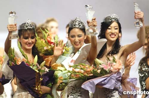 9月5日晚,“時(shí)尚杭州之旅·2004年新絲路世界模特大賽”在浙江省人民大會(huì)堂舉行,來(lái)自二十八個(gè)國(guó)家的四十七名選手經(jīng)過(guò)禮服、泳裝、晚裝展示、情景劇表演以及系列專(zhuān)業(yè)技能展示的比賽,大賽桂冠最終被中國(guó)選手李子寧(中)奪走,烏克蘭選手左娜·高維科(左)和韓國(guó)選手Kwon Hyun Ji分列二三名。中新社記者:盛佳鵬