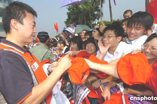 國家奧運金牌代表團9月7日在香港展開觀光之旅,9時45分抵達灣仔金紫荊廣場參觀,吸引大批市民圍觀,圖為馬琳為熱情的香港市民簽名。作者:趙振清