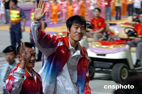 “奧運(yùn)金牌精英大匯演”7日晚上在香港政府大球場(chǎng)舉行,全場(chǎng)爆滿(mǎn)。圖為勇奪奧運(yùn)田徑110米欄金牌的劉翔進(jìn)場(chǎng)時(shí)向在場(chǎng)人士揮手。作者:洪少葵