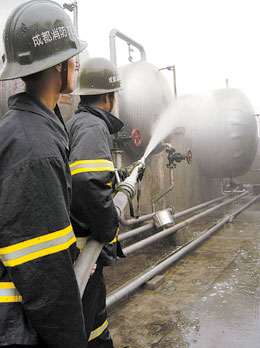 昨日上午10時許,成都商報記者第一時間趕往現(xiàn)場時,數(shù)十臺消防車早已投入戰(zhàn)斗。油庫內戒備森嚴、秩序井然,各個出口早已拉起了警戒線。記者站在油庫附近的高坡上,遠遠看去,10臺高壓水槍分工明確,正分頭向發(fā)生大火的真空泵附近噴水。此時,油庫內的明火已經被徹底撲滅,濃煙也已經散去。昨日中午12時許,現(xiàn)場勘查組、環(huán)境監(jiān)測組向總指揮反應:空氣中的油分子已經下降至安全水平,而溝渠中的含量比率也下降至安全水平。昨日下午4時,在奮戰(zhàn)了6個小時候并確定險情已經徹底解除后,搶險才結束。