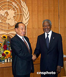 當(dāng)?shù)貢r間九月二十七日,正在紐約聯(lián)合國總部出席第五十九屆聯(lián)大的中國外長李肇星與聯(lián)合國秘書長安南會晤,雙方就聯(lián)合國作用、改革和發(fā)展以及蘇丹達(dá)爾富爾等問題交換了看法。作者:趙海燕